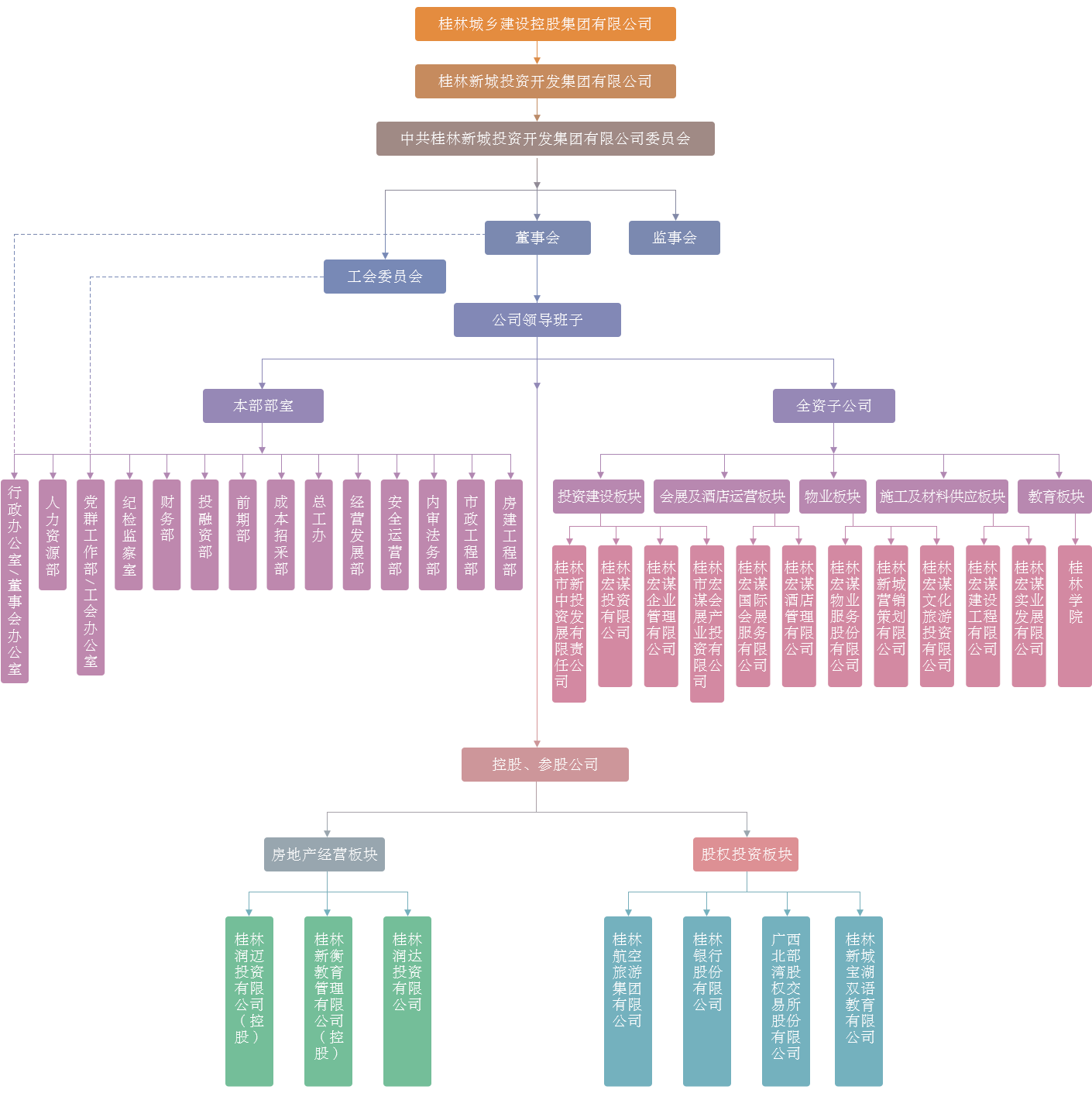 公司下設12個全資子公司,分為五大板塊,其中(一)投資建設板塊:桂林市新中投資發(fā)展有限責任公司、桂林宏謀投資有限公司、桂林宏謀企業(yè)管理有限公司、桂林市宏謀會展產業(yè)投資有限公司;(二)會展及酒店運營板塊:桂林宏謀國際會展服務有限公司、桂林宏謀酒店管理有限公司;(三)物業(yè)板塊:桂林宏謀物業(yè)服務股份有限公司、桂林新城營銷策劃有限公司、桂林宏謀文化旅游投資有限公司;(四)施工及材料供應板塊:桂林宏謀建設工程有限公司、桂林宏謀實業(yè)發(fā)展有限公司;(五)教育板塊:桂林學院。