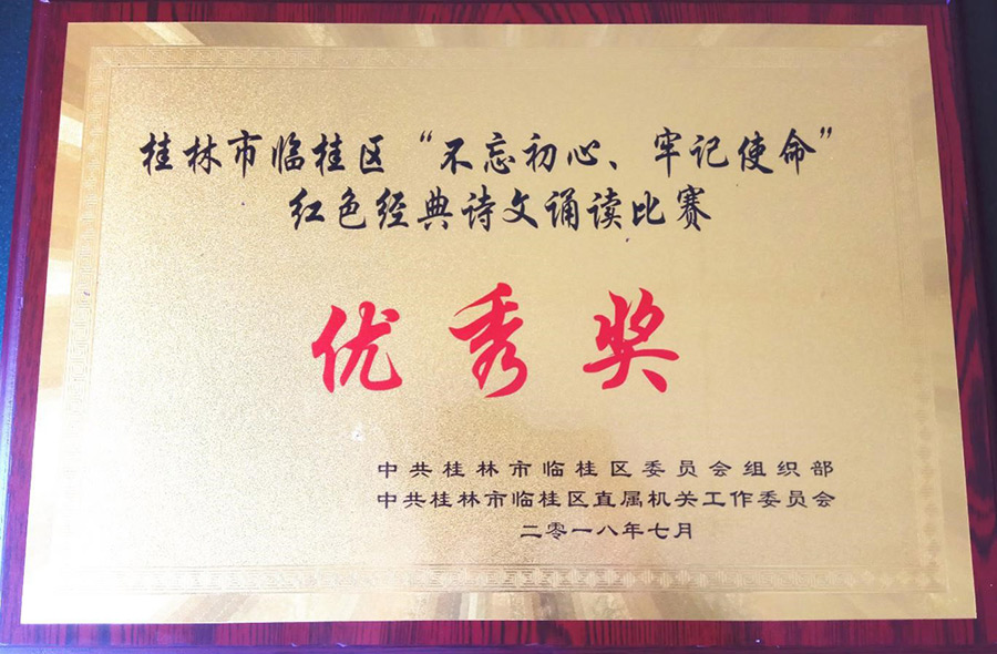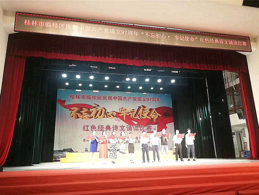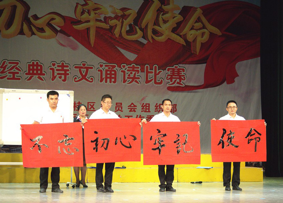 活動(dòng)中,選手們通過(guò)朗誦紅色經(jīng)典詩(shī)詞,深情回顧黨的光輝歷程、謳歌黨的豐功偉績(jī),真誠(chéng)地表達(dá)了對(duì)黨、對(duì)祖國(guó)的擁護(hù)與熱愛(ài)之情。參賽選手們儀態(tài)莊重大方,朗誦聲情并茂,以配樂(lè)、舞蹈、書法展示等多種形式,或深情款款、或激情高昂,用飽滿的熱情將紅色經(jīng)典的內(nèi)涵精彩地展現(xiàn)在觀眾面前,充分展示了臨桂區(qū)廣大黨員干部的良好精神風(fēng)貌。新城投資集團(tuán)黨支部四名黨員聲情并茂地共誦《不忘初心,牢記使命,我們永遠(yuǎn)在路上》,節(jié)目形式新穎,選手感情充沛,朗讀完詩(shī)歌后,黨員譚佳璐現(xiàn)場(chǎng)飽含情感的用毛筆書寫了“不忘初心,牢記使命”八個(gè)大字,表達(dá)了黨員們樹(shù)立遠(yuǎn)大的理想、力爭(zhēng)上游、為祖國(guó)的強(qiáng)盛貢獻(xiàn)力量的決心。與其說(shuō)這是紅色經(jīng)典詩(shī)文誦讀,不如說(shuō)這是一次視聽(tīng)盛宴,更是黨員們愛(ài)黨愛(ài)國(guó)的精彩演繹。