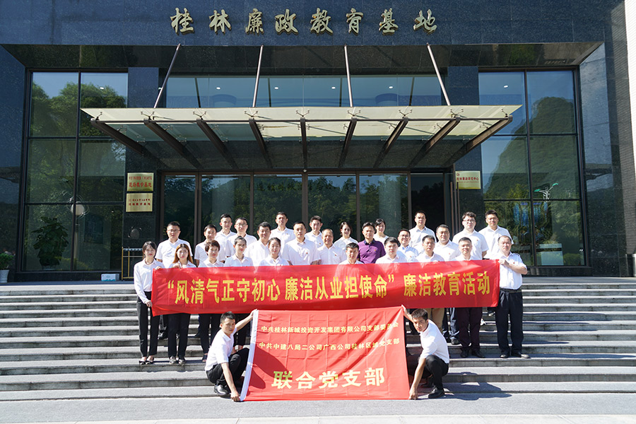 為進(jìn)一步增強(qiáng)桂林市紀(jì)檢監(jiān)察綜合業(yè)務(wù)基地建設(shè)工作的光榮感、使命感和成就感,7月31日上午,市紀(jì)委、市監(jiān)委特別安排基地主要參建單位中共桂林新城投資開(kāi)發(fā)集團(tuán)有限公司支部委員會(huì)、中共中建八局二公司廣西公司桂林區(qū)域支部委員會(huì)聯(lián)合黨支部參觀了桂林廉政教育基地,開(kāi)展了一項(xiàng)“風(fēng)清氣正守初心 廉潔從業(yè)擔(dān)使命”廉潔教育活動(dòng)。