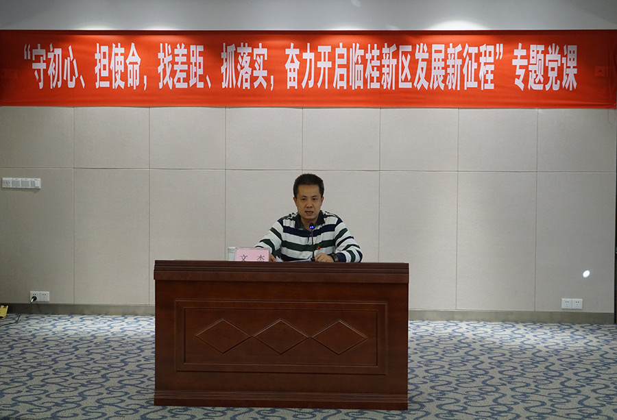 11月4日,按照主題教育安排部署,臨桂新區(qū)工委委員、管委會(huì)副主任文杰以“守初心、擔(dān)使命,找差距、抓落實(shí),奮力開(kāi)啟臨桂新區(qū)發(fā)展新征程”為主題,為新城投資集團(tuán)全體黨員、積極分子、中層副職以上干部上了一堂專(zhuān)題黨課。