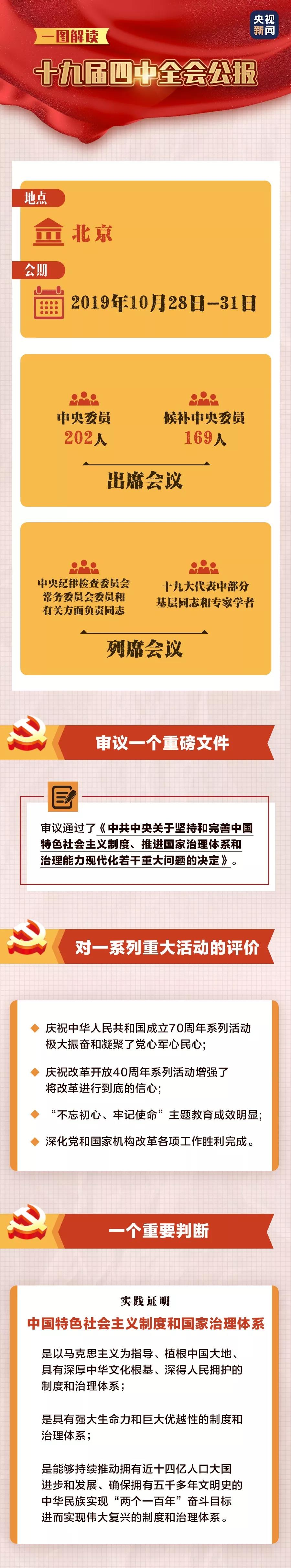 黨的十九屆四中全會(huì)在北京勝利閉幕,這是在慶祝新中國成立70周年的重要節(jié)點(diǎn),向全面建成小康社會(huì)、實(shí)現(xiàn)第一個(gè)百年奮斗目標(biāo)邁進(jìn)的關(guān)鍵之年召開的一次重要會(huì)議,充分肯定我們黨治理國家取得的歷史性成就,全面總結(jié)我國國家制度和國家治理體系的顯著優(yōu)勢,明確了加強(qiáng)和完善國家治理必須堅(jiān)持的基本原則以及總體目標(biāo)、工作要求,為堅(jiān)定制度自信、實(shí)現(xiàn)偉大夢想提供了根本遵循,指明了正確方向。