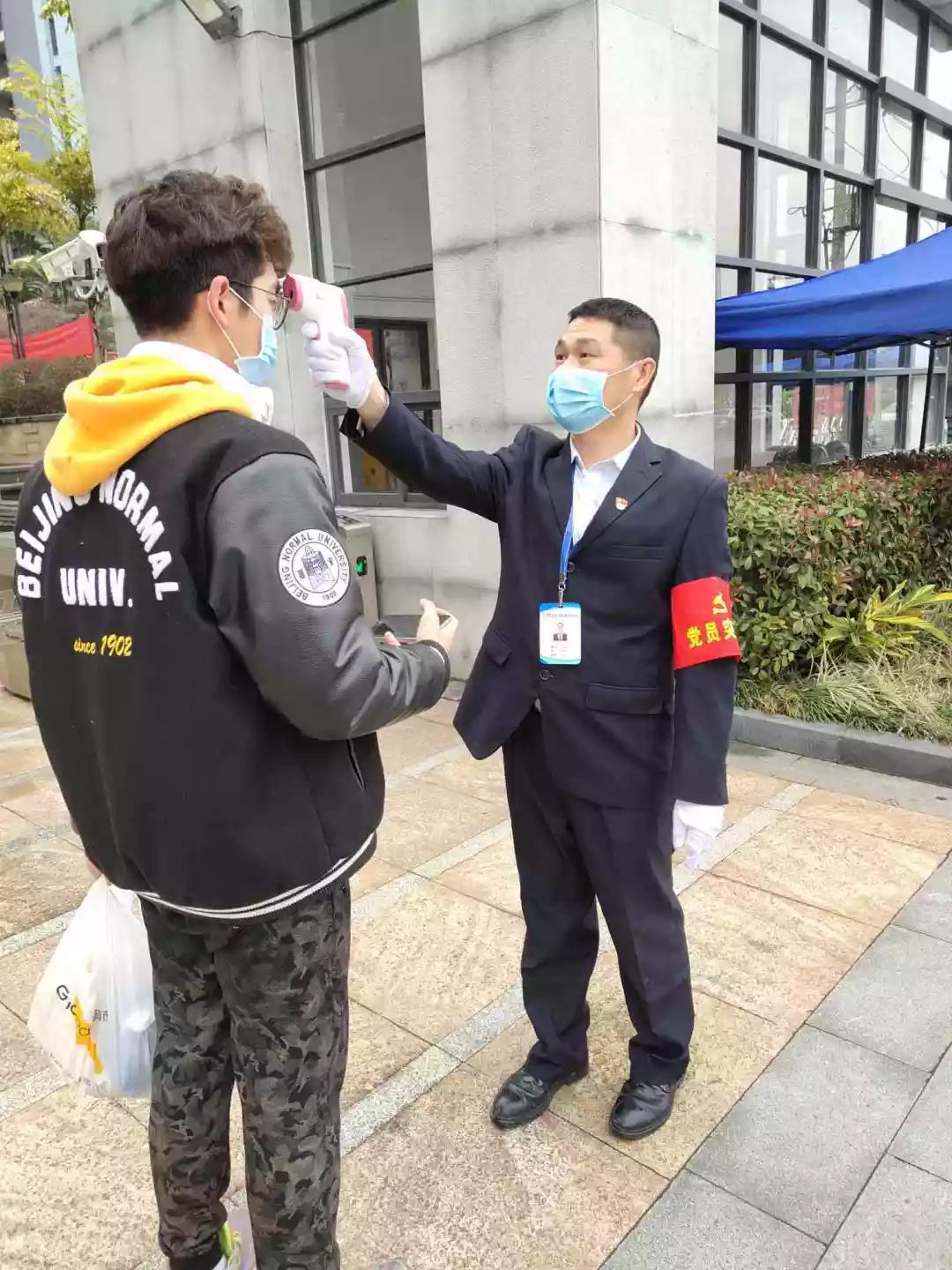 ▲疫情防控崗在為進(jìn)入辦公樓人員測體溫。