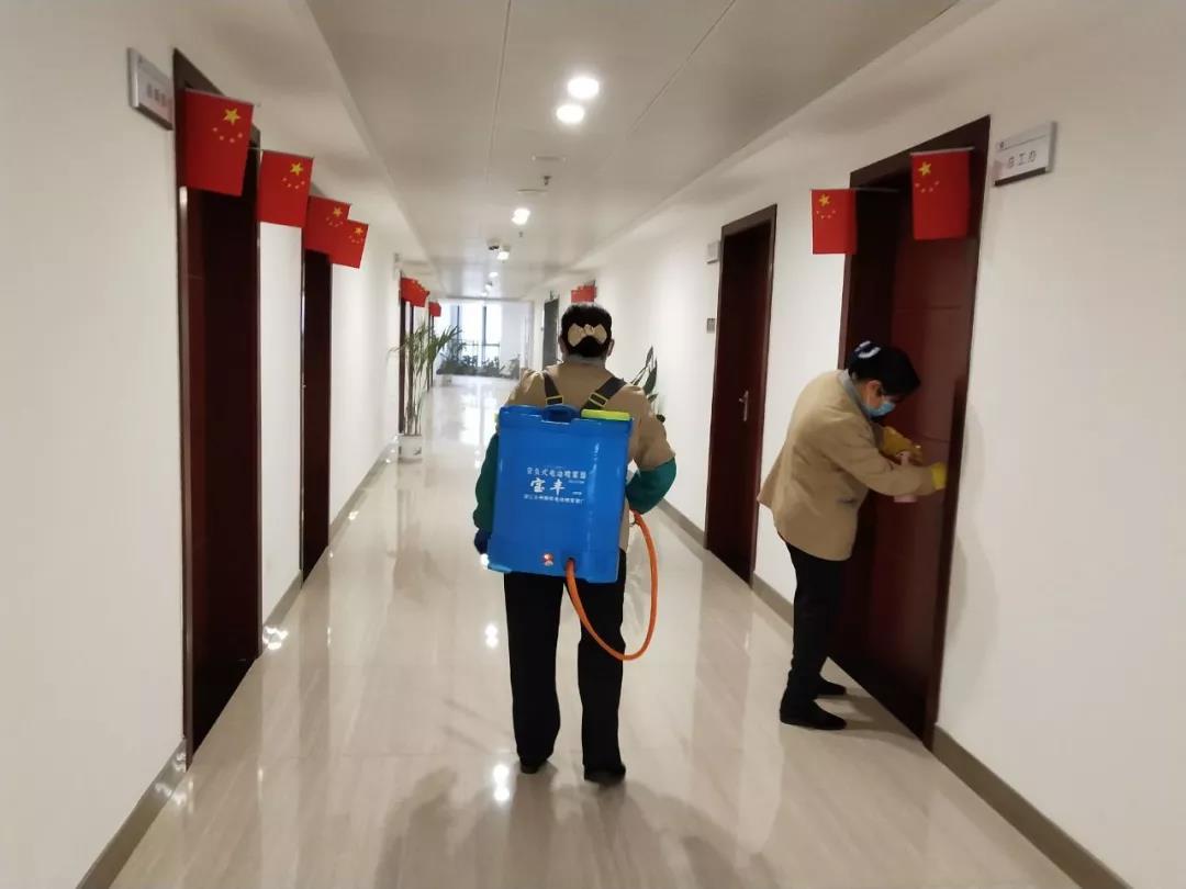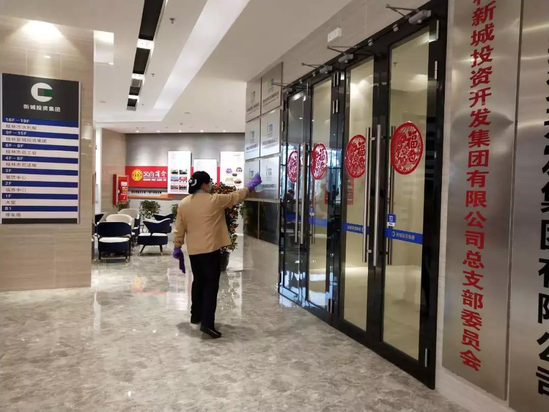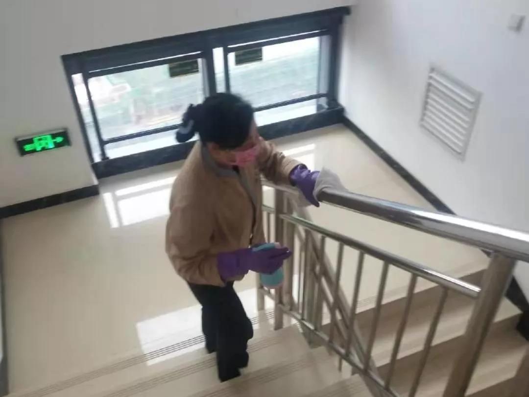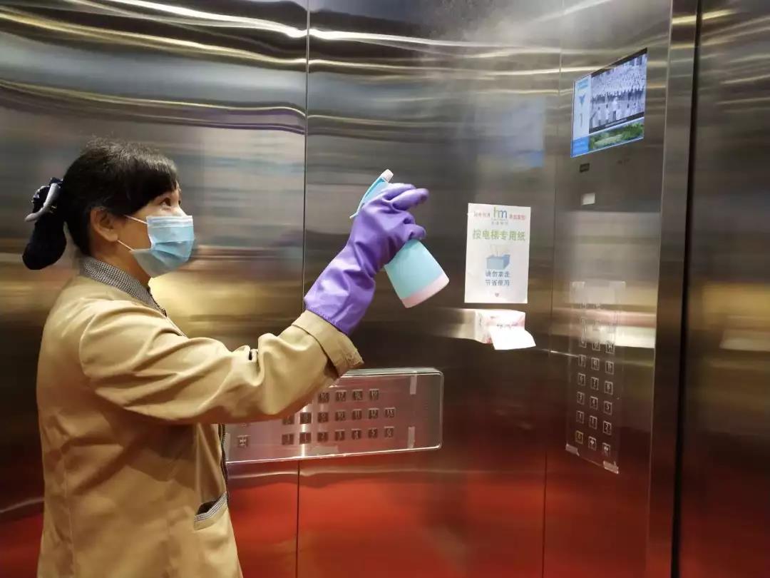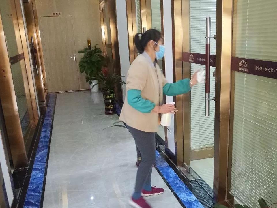 ▲保潔人員在對電梯、出入門廳、辦公區(qū)域、樓梯間、衛(wèi)生間等地進(jìn)行全面消毒。
