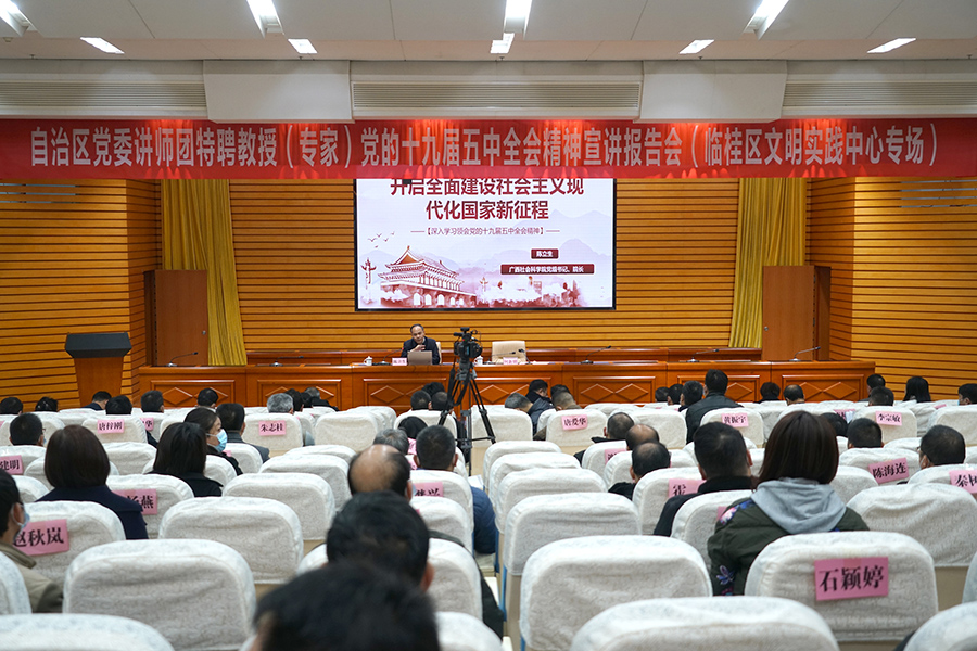 11月27日上午,自治區(qū)黨委講師團黨的十九屆五中全會精神宣講報告會在臨桂新區(qū)工委會議室舉行。廣西社會科學(xué)院黨組書記、院長陳立生作了題為“開啟全面建設(shè)社會主義現(xiàn)代化國家新征程”宣講。臨桂新區(qū)工委第一副書記、管委會主任、臨桂區(qū)區(qū)委書記何新明主持報告會,并作臨桂新區(qū)黨的十九屆五中全會精神學(xué)習(xí)動員講話。