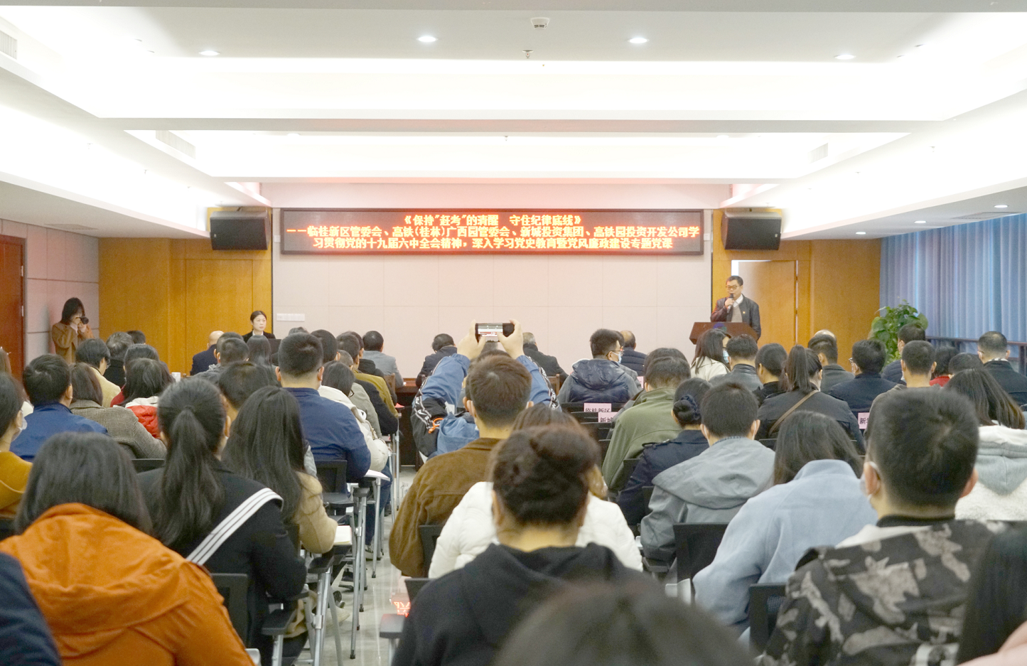 為深入貫徹落實全面從嚴治黨要求,進一步推進黨風廉政建設和反腐敗工作深入開展,增強黨員干部廉潔自律意識和拒腐防變能力,11月25日,市紀委監(jiān)察委駐臨桂新區(qū)管委會紀檢監(jiān)察組組長、臨桂新區(qū)黨工委委員石安蘭在新城投資集團十樓會議室開展綜合監(jiān)督單位集體廉政談話暨《保持“趕考”的清醒 守住紀律底線》專題黨課。市紀委監(jiān)察委駐臨桂新區(qū)管委會紀檢監(jiān)察組副組長唐良平主持專題黨課。臨桂新區(qū)管委會、高鐵(桂林)廣西園管委會、新城投資集團、高鐵園投資公司等4家單位120多名黨員干部聆聽了黨課。
