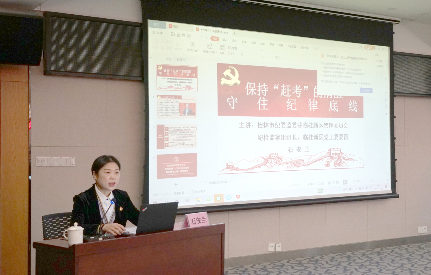 通過《保持"趕考"的清醒 守住紀律底線》的專題黨課,石安蘭闡述了當前黨風廉政建設和反腐敗斗爭形勢,尤其是圍繞黨的紀律和貪污受賄挪用公款等職務犯罪,結合典型案例,深入講解了黨員干部常見的違紀違法行為,剖析其原因,對黨員干部拒腐防變提出了堅定理想信念、敬畏法紀、秉公用權、不要貪財、謹慎交友、樹立清廉家風等十個方面要求。黨課還穿插播放了桂林市近年違法違紀黨員干部的懺悔視頻,提高了黨課的警示性和生動性。整個黨課內容豐富,案例生動,令人警醒,讓黨員干部受到了一次深刻的思想洗禮與廉政教育。