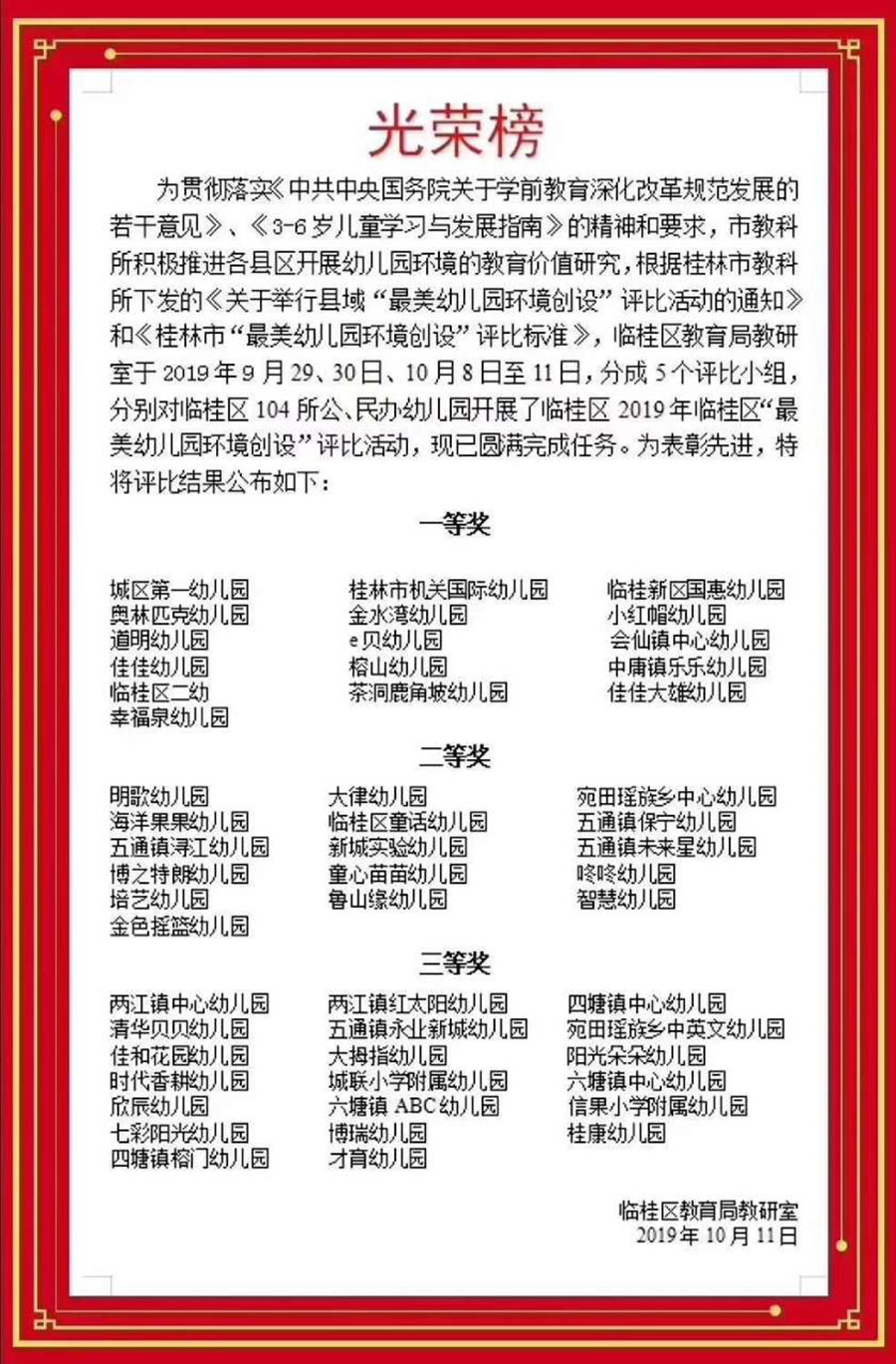 近日,臨桂區(qū)教育局教研室積極推進(jìn)開展幼兒園環(huán)境的教育價值研究,舉辦了 “最美幼兒園環(huán)境創(chuàng)設(shè)”評比活動。國惠幼兒園在評比中榮獲2019年臨桂區(qū)“最美幼兒園環(huán)境創(chuàng)設(shè)”一等獎。