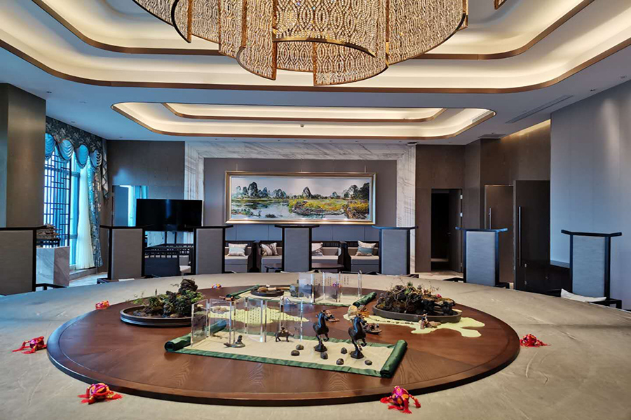 試業(yè)的桂林宏謀大酒店,充分展現(xiàn)現(xiàn)代藝術酒店的低調(diào)、大氣、有內(nèi)涵。巨型的漓江黃布倒影油畫、璀璨的銅鼓吊燈、云卷的砂巖壁畫……大家被名家友情布展酒店的字畫、雕塑精品的獨特文化氛圍感染,感嘆酒店有深度的藝術魅力。參觀的員工紛紛駐足拍照,發(fā)朋友圈廣泛宣傳藝術的宏謀、文化的酒店。