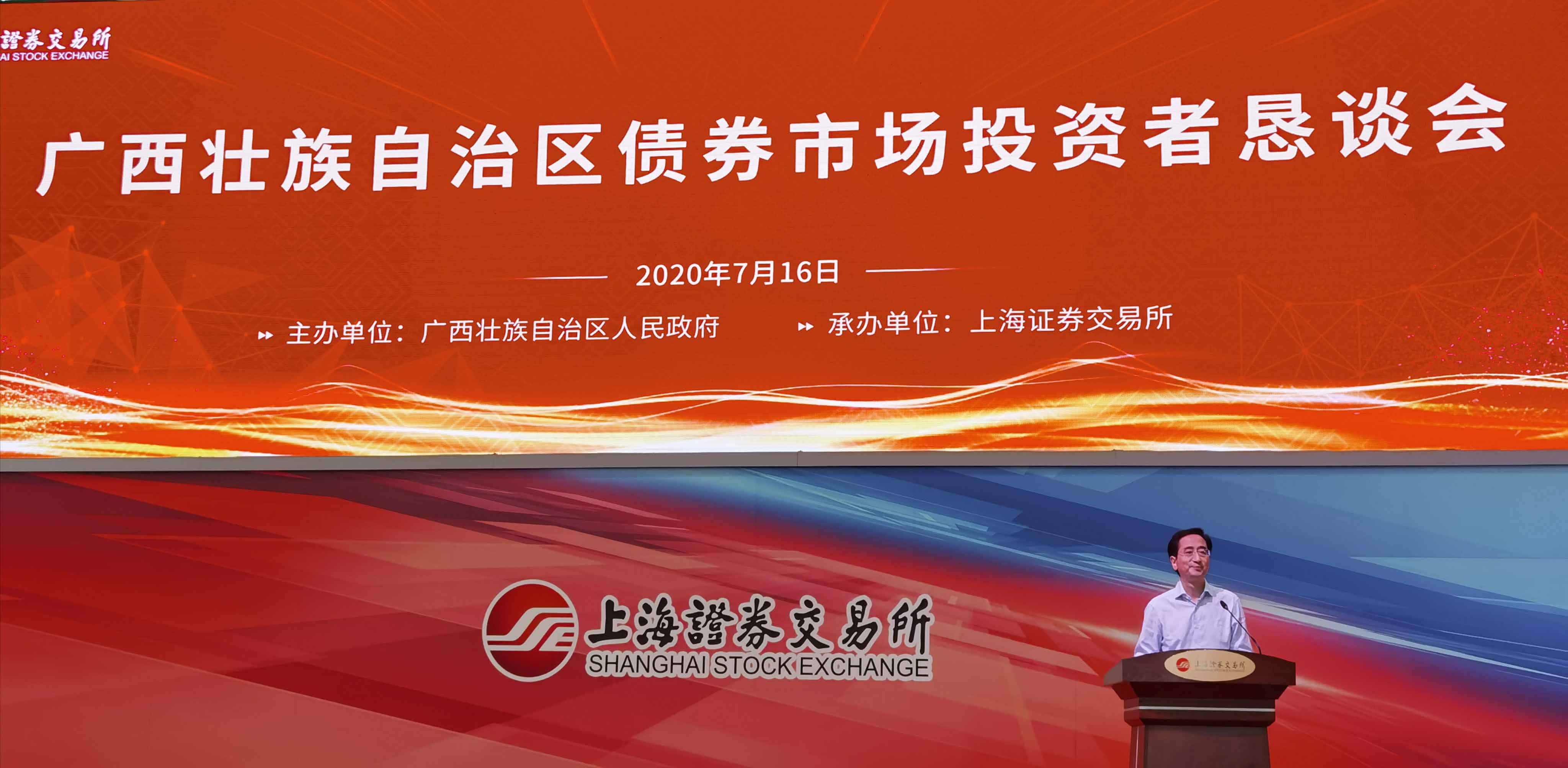 為貫徹落實《中共中央 國務(wù)院關(guān)于新時代推進(jìn)西部大開發(fā)形成新格局的指導(dǎo)意見》,提升西部地區(qū)直接融資比例,切實提升廣西債券融資能力,助推廣西經(jīng)濟(jì)高質(zhì)量發(fā)展,廣西壯族自治區(qū)人民政府于2020年7月16日在上海證券交易所舉辦了廣西壯族自治區(qū)債券市場投資者懇談會。國泰君安證券、申港證券、交通銀行等國內(nèi)30余家金融機構(gòu)代表及廣西投資集團(tuán)、北部灣投資集團(tuán)、廣西物質(zhì)集團(tuán)、柳州東城集團(tuán)等20余家廣西區(qū)內(nèi)大型知名企業(yè)參加了本次懇談會。上海證券交易所黨委書記、理事長黃紅元(副部長級)出席會議,上海證券交易所副副總經(jīng)理劉紹統(tǒng)、廣西區(qū)人大常委會副主任張曉欽先后致辭發(fā)言,廣西金融監(jiān)管局、廣西財政廳負(fù)責(zé)人介紹了廣西債券發(fā)行工作情況。