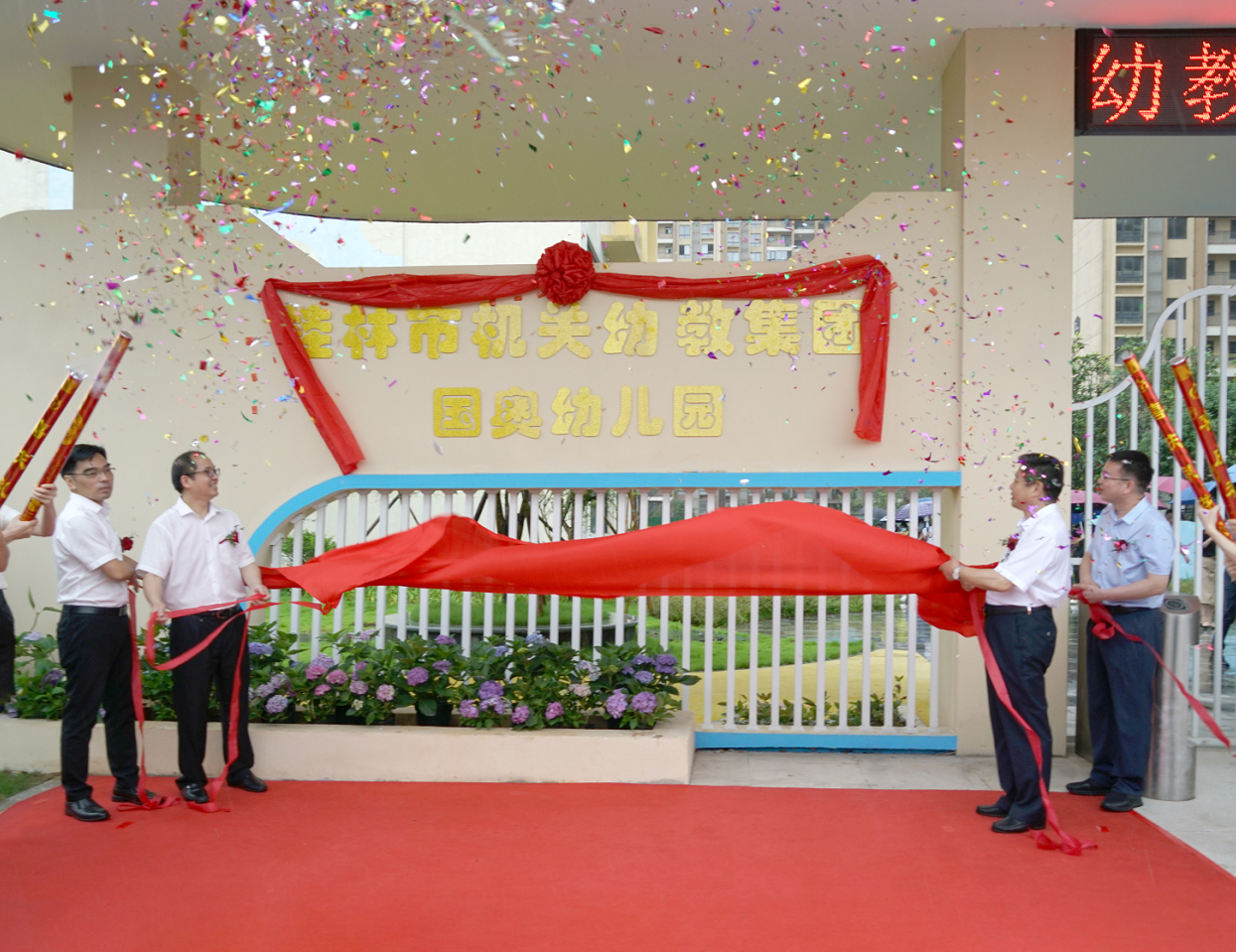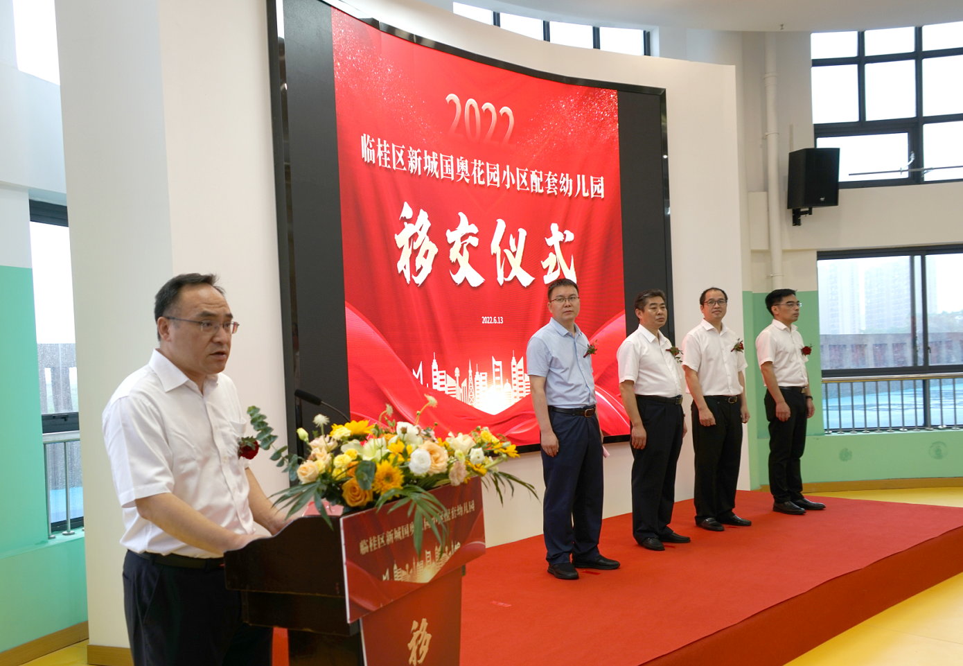 2022年6月13日,桂林市臨桂區(qū)新城國奧花園小區(qū)配套幼兒園交接儀式在幼兒園室內小禮堂舉行。市機關事務管理局黨組書記、二級巡視員吳殷丹,市機關事務管理局局長戴波,臨桂新區(qū)黨工委委員、管委會常務副主任李星明,臨桂區(qū)常務副區(qū)長周波,新城投集團黨總支副書記、總經理黃峻出席交接儀式?;顒佑膳R桂區(qū)蔣東兵副區(qū)長主持。