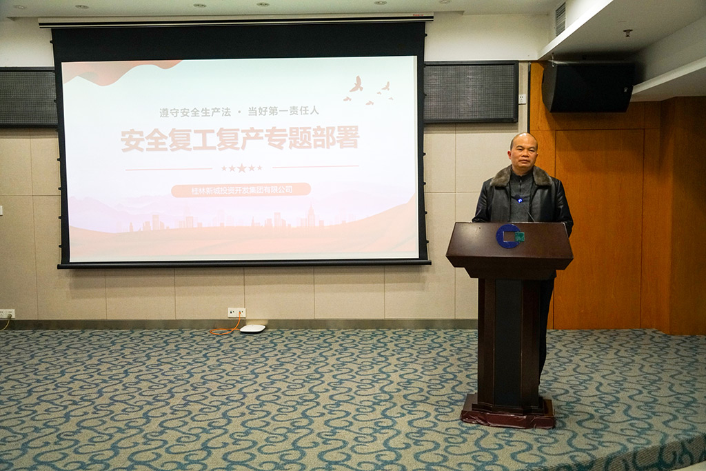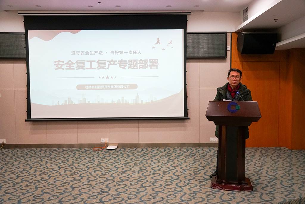 為深入貫徹落實桂林市國資委及城建集團(tuán)關(guān)于節(jié)后復(fù)工復(fù)產(chǎn)的工作要求,進(jìn)一步做好春節(jié)后企業(yè)安全復(fù)工復(fù)產(chǎn)工作,確保全國“兩會”前后全區(qū)安全穩(wěn)定。2024年3月4日,新城投集團(tuán)召開2024年春節(jié)后安全復(fù)工復(fù)產(chǎn)工作專題部署會暨全體員工節(jié)后復(fù)工復(fù)產(chǎn)動員大會,會議針對近期全國消防火災(zāi)事故頻發(fā)現(xiàn)狀進(jìn)行了警示宣傳教育,同時傳達(dá)上級安全復(fù)工復(fù)產(chǎn)、火災(zāi)防控等相關(guān)文件精神。受公司黨委副書記(主持工作)、副董事長、總經(jīng)理朱毅委托,黨委副書記兼紀(jì)委書記、監(jiān)事會主席、工會主席譚力源出席會議并講話,會議由公司黨委委員、董事、副總經(jīng)理葉青旺主持。