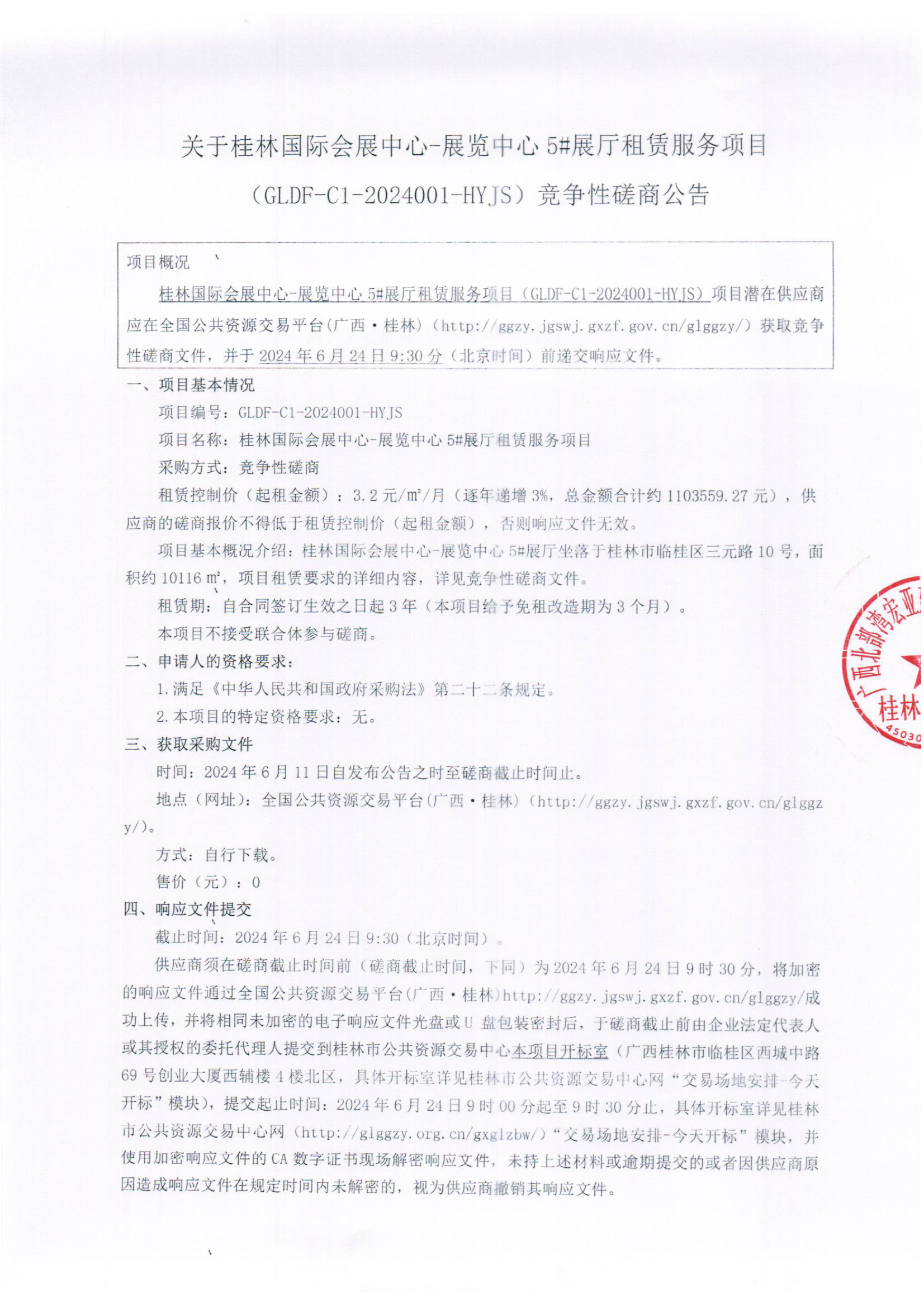 關(guān)于桂林國際會展中心-展覽中心5#展廳租賃服務項目(GLDF-C1-2024001-HYJS)競爭性磋商公告