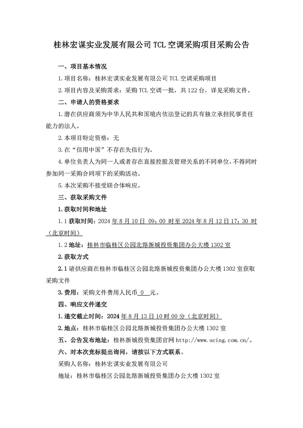 桂林宏謀實業(yè)發(fā)展有限公司TCL空調采購項目采購公告