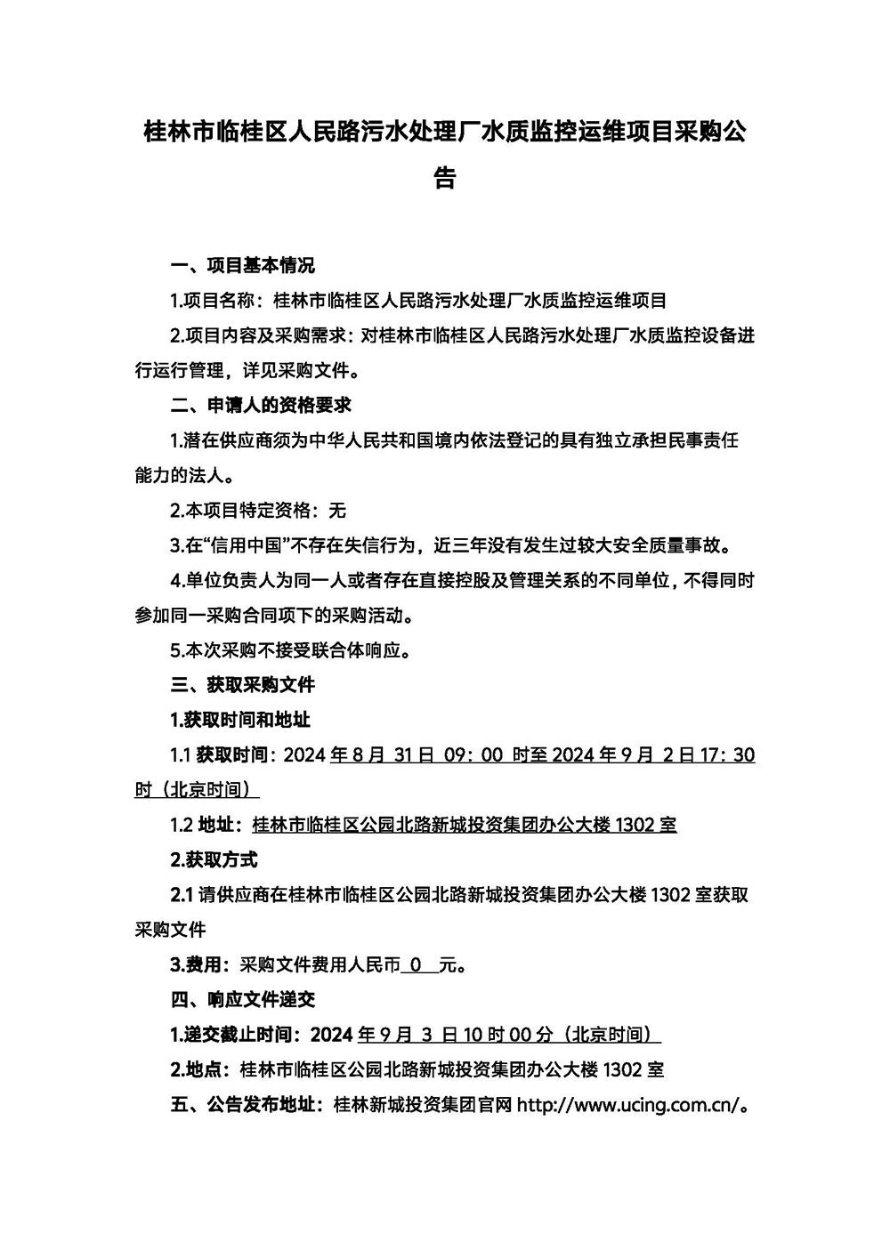 桂林市臨桂區(qū)人民路污水處理廠水質(zhì)監(jiān)控運(yùn)維項(xiàng)目采購(gòu)公告