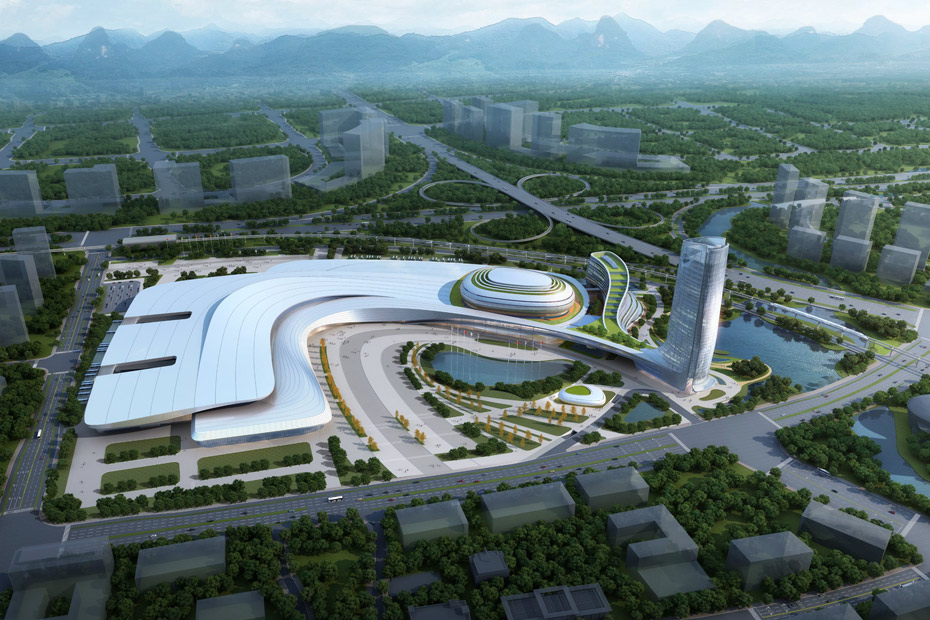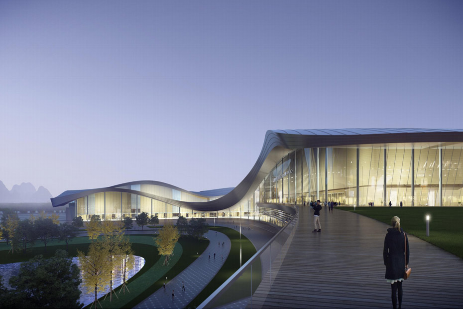 桂林國際會(huì)展中心是集會(huì)議、會(huì)展、商業(yè)、接待為一體的大型綜合性建筑,規(guī)劃用地面積約750畝,一期總建筑面積約39.7萬平方米,其中一期室內(nèi)凈展面積為6萬平方米,室外展面積為5萬平方米,會(huì)議中心凈使用面積約1.5萬平方米,第一接待中心(四星標(biāo)準(zhǔn),含350間客房)以及第二接待中心(五星標(biāo)準(zhǔn),含450間客房)。